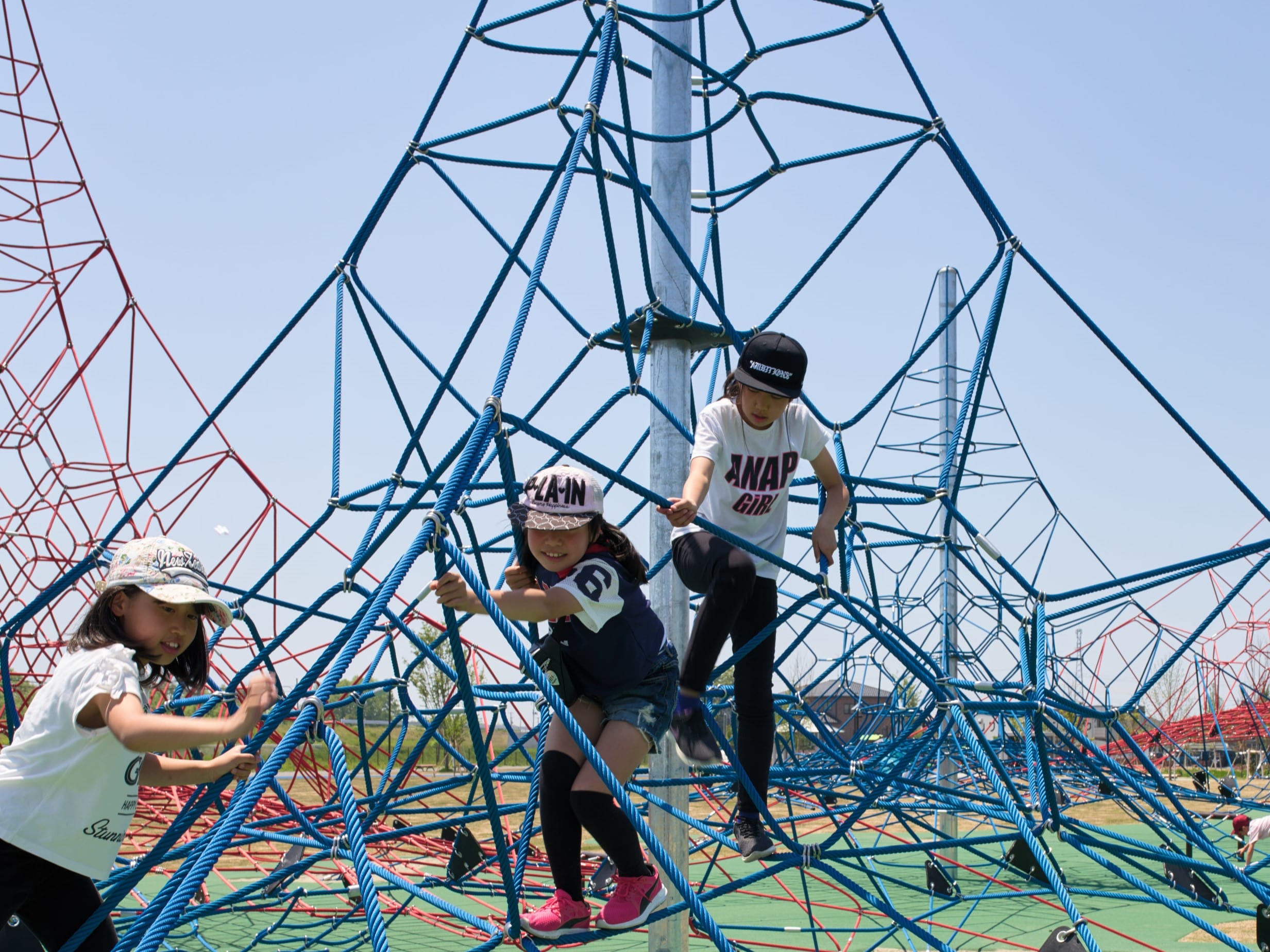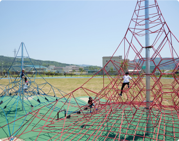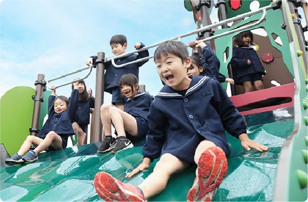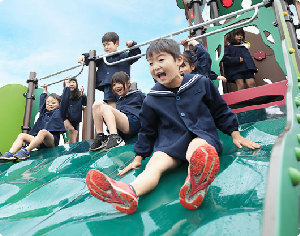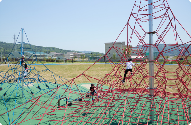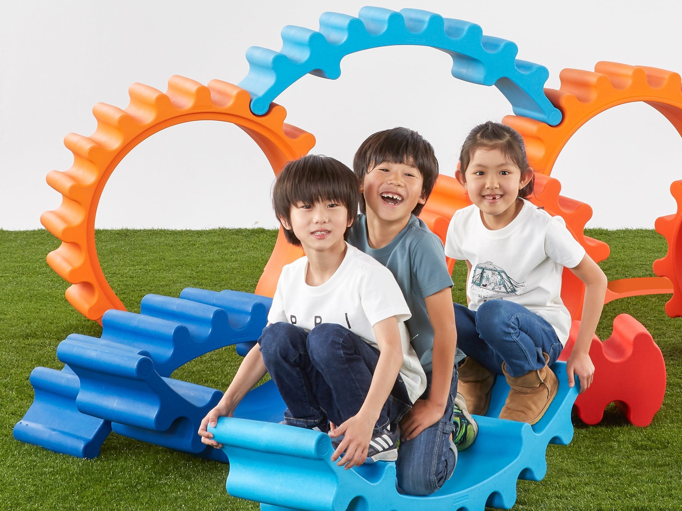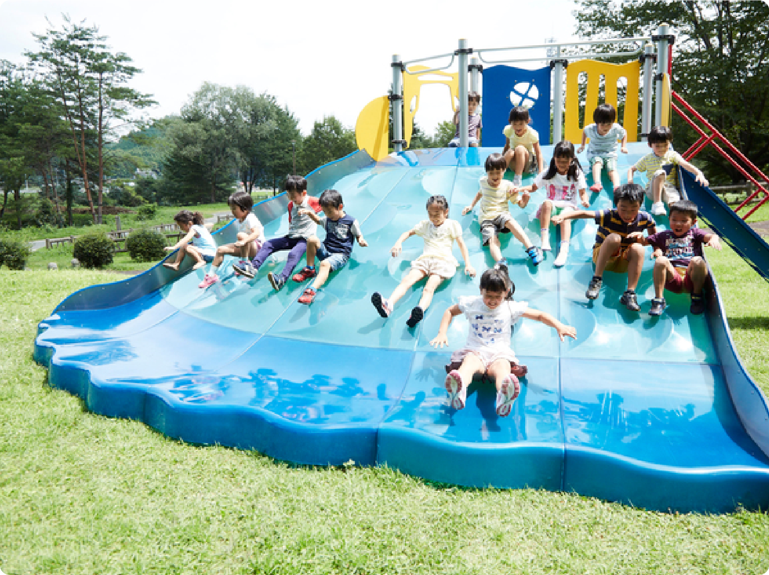 1つの遊具の中で難易度の違う遊びを選んで遊んでいる周囲を見て、できるようになりたい・面白いと「思う」ココロを育む。大勢でいっしょに遊ぶことができるので自然とコミュニケーションが生まれます。