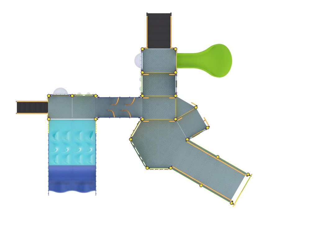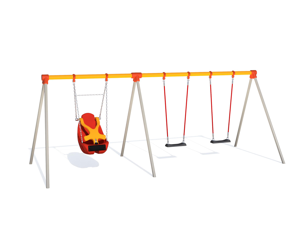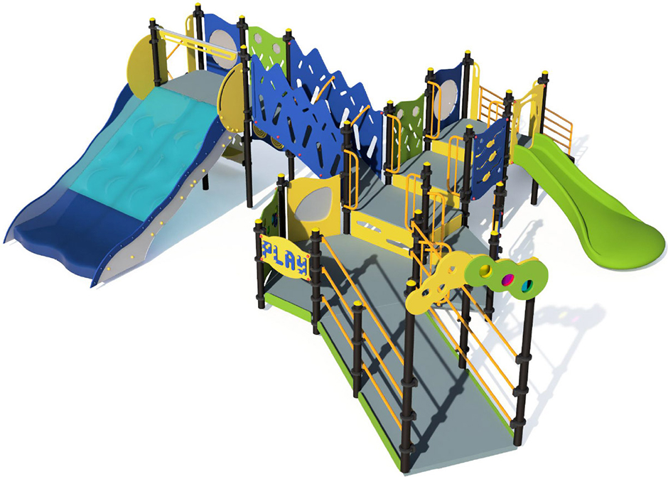安心感を持って楽しめるコンビネーションです。スロープから車椅子のまま遊具にアクセスできます。車椅子から乗り移った先にはベロスライダー、モーグルヒルと2つの目標があり、行先を選択できます。